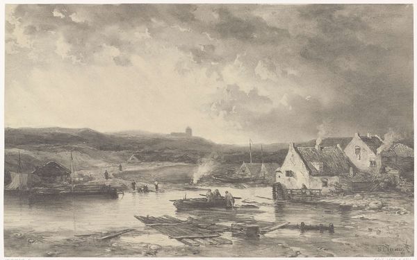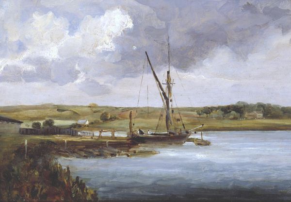 Curator: So, this is "Pequot Light House, Connecticut Coast," painted by Robert Henri in 1902. What's your take? Editor: Bleakly beautiful. I feel a real North Atlantic shiver, like one of those summer storms rolling in off the Sound. There's something a bit unsettling, maybe in the color palette? It makes me feel slightly uneasy. Curator: Henri was definitely capturing a mood. Light houses themselves carry immense symbolic weight—hope, guidance, a warning against treacherous waters. And then, to place it in a cityscape with a moody atmospheric landscape as he does here… the symbolism only compounds. Editor: Right! It's that contrast of solid, unwavering light and, honestly, ominous clouds. And it is more landscape painting than cityscape, in a way—as a work done ‘en plein air’ you'd assume, the primary focus and concern for Henri. The scene isn’t idealized or heroic in any conventional sense; the light isn't romanticized. It’s work, vigilance... warning. Curator: Absolutely. I agree. The brushstrokes and technique feel so alive, even spontaneous, perfectly capturing the shifting, ephemeral nature of the weather, and time of day. The light from above reflecting through a patch in the cloudy, grayish-green, and even yellowish sky… Editor: … almost menacing sky. That ship seems very far. Curator: You got it! He's not afraid to present a touch of foreboding, not relying on cliché representations of the maritime, but in exploring how to connect the individual viewer to a sense of scale. Editor: Which makes this, as landscape art goes, something much more interesting and modern to our senses, perhaps. Instead of celebrating picturesque views, it delves into the less glamorous but somehow very vital relationship we have with these spaces. Curator: Right. There is nothing particularly "pretty" about it. The ocean has teeth, and Henri wants us to see them. The scene gives us a space for considering scale—between human endeavour (the lighthouse and ships), and nature. And notice also: it gives our human figures diminished space. It reminds me of some old folklore. I wouldn’t be surprised if sailors are known for telling similar dark stories while stationed in that very light house. Editor: See, now you've got my imagination spinning tales of maritime mysteries and spectral figures in fog! That adds a layer to viewing Henri's painting, realizing these lights aren't just about practical navigation, but also about conjuring, confronting, and assuaging all sorts of internal emotional seas. Well, I think I need a shot of something warm and maybe a whale-tale yarn! Curator: Indeed. Henri manages to do a lot with an unassuming image, imbuing it with layers of cultural and psychological significance. A final shiver for the road!