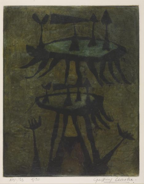 Louis Schanker made this print, Static and Revolving, using a woodcut, a process in which he carved into the wood and then printed the image. It’s all about lines here: hatching, cross-hatching, scribbles that catch the light. Look at the lower right corner. You can almost feel Schanker’s hand moving, creating a dense, rhythmic pattern. It reminds me of those doodles I make when I'm on the phone. The way he builds up layers of marks is almost like he's sculpting the light, pulling it in and out of the darkness. This print reminds me a bit of Joan Miró. There is something in the strange composition, but also the limited palette and use of black as a ground for his figures to play on. Art is always in conversation, and Schanker is very clearly listening in!