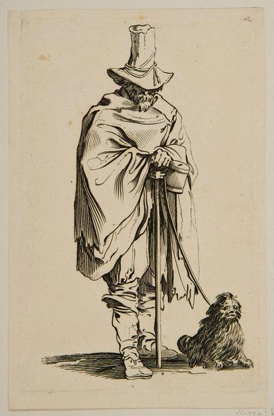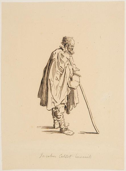 Curator: This is Adrian Ludwig Richter's "Hurdy-Gurdy Player, after Callot." Richter, born in 1803, created this work referencing the earlier artist Callot. Editor: The figure seems so isolated, doesn't he? His gaze is averted, and the shading emphasizes his solitary existence, like a relic from a bygone era. Curator: Indeed. Richter’s choice to revisit Callot speaks to the enduring fascination with marginalized figures, placing them in conversation with evolving social perceptions across time. Editor: I find myself wondering about the social commentary here. Is Richter simply documenting a type, or is he inviting us to consider the plight of the itinerant musician? Curator: It's a question of the politics of representation, isn't it? How do we see this individual and his role within society? Editor: A poignant reminder of the stories art can tell about who we choose to see and who we often overlook. Curator: Precisely, and how those choices reflect the values of the society producing and viewing the art.
