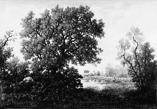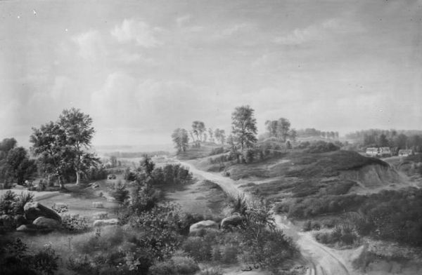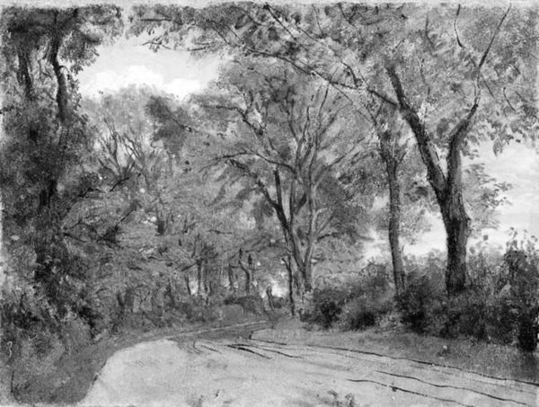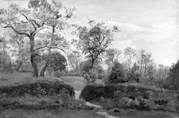 Curator: Julius Hellesen painted "A Landscape near Ordrup, Zealand" in 1841. It exemplifies plein-air painting in Denmark at the time. Editor: It’s austere, almost somber, despite the idyllic scene. The limited tonal range creates a rather still atmosphere. Curator: Its monochrome palette aligns it with Romanticism's tendency to idealize through emotionalized and aestheticized depictions of nature. The absence of vibrant color focuses our attention on the formal qualities—composition, light, and shadow. Editor: Yes, the stark contrast of light and shadow lends a powerful symbolism to the forest. Trees often stand for growth, interconnectedness, a bridge between the earthly and the divine... but here, devoid of color, they project an echo of these archetypes, drained and mute. Curator: Interesting observation, that silence. We need to consider that artists of Hellesen’s era engaged actively with discourses about national identity. We might look at this not as an objective landscape study, but a construction intended to evoke specific feelings. This work prompts a consideration of the power structures inherent in Romantic visions of nationhood, even within the ostensibly neutral realm of landscape painting. Editor: I would agree—the artist guides us through the starkly rendered pathway, a symbolic journey—not merely into the forest, but a meditation on cultural heritage itself, rendered in solemn tones. The subtle suggestion of deer, those often romanticized creatures, they contribute to the tapestry, reminding us perhaps of humanity’s own, lost, connection to nature's silent narrative. Curator: The limited palette pushes viewers toward a stark binary between progress and tradition, city and countryside, known and unknown. It emphasizes the visual representation of specific social constructions. Editor: Looking back, the symbols invite such varied readings, reminding us how art transforms meaning across generations. Curator: Exactly! Appreciating art is a dialogue across centuries—in understanding and contesting prevailing meanings. Editor: An evocative, and enduring silence.