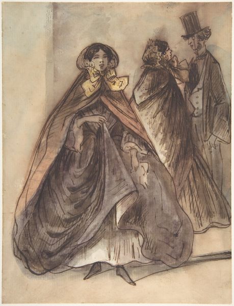 Editor: Edwin Austin Abbey’s *Study. Three Figures* presents three figures in what appears to be watercolor and colored pencil. There is something profoundly sad about the bowed heads of the figures on the right that is catching my attention. What strikes you most about this piece? Curator: You know, that’s astute. There’s a theatrical quality to this work. I wonder if Abbey wasn’t envisioning a stage scene – perhaps something Shakespearean, given his later work. Notice how he uses color to differentiate the figures. The woman on the left, draped in yellow stripes, stands apart – literally, visually. The other two, huddled together in shades of brown and white, share a sorrow, a secret. The stark background almost feels like a spotlight isolating them. I mean, what story do you imagine unfolding here? Editor: I see what you mean. Perhaps it is from a play...Maybe the woman in yellow has delivered news that the others find devastating? Do you think it's a coincidence she has a certain sense of composure compared to the others? Curator: I'd posit it is not at all coincidence! I mean, it is quite considered that, with her hand raised to her chest, her slight incline to the left suggests more of a protective nature as she relays news. Now you, are composing possible histories and that’s art humming within. I love how a single image can open up a universe of narratives. Editor: Yes, it is fun. Thinking about theatre is fun as it makes you ask: where would the music sit within a performance? Where would light strike to give emotion to the play and this drawing? I'll have to keep Abbey in mind for this consideration!