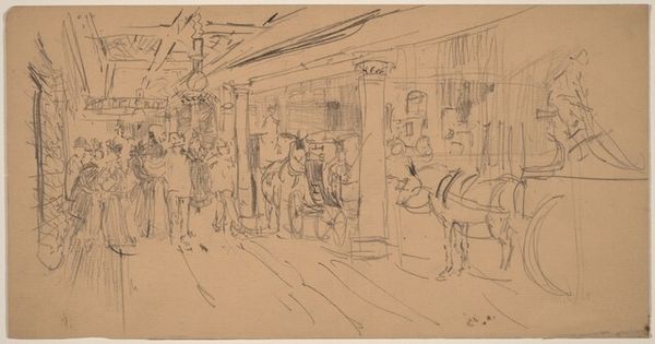 Editor: This is James McNeill Whistler's "Chelsea Fruit Shop." I love how the figures are just suggested, almost ghostly. What do you see in this piece? Curator: The symbolism here is subtle yet potent. Notice how the fruit stand, overflowing with produce, represents abundance and fertility, contrasting with the ephemeral, fleeting nature of the figures. What cultural memories might this juxtaposition evoke? Editor: Perhaps the transient nature of life against the constant renewal of nature? Curator: Precisely. Whistler uses these visual cues to trigger deeper reflections on time, mortality, and the cyclical patterns of life embedded in everyday scenes. Editor: I hadn't considered the depth of those images! Curator: The enduring power of art lies in its ability to transform the mundane into the symbolic.