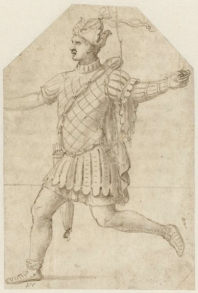 Editor: Here we have Michel Kirmer's "A Standing Soldier" from 1561, rendered through engraving and intaglio. It reminds me of a character sketch, but one with incredibly detailed attire. How do you read this piece? Curator: I see it as more than just a character sketch; it's a powerful articulation of 16th-century masculinity and militarism, rife with cultural anxieties. What does it mean to portray a soldier so meticulously, in a period defined by religious conflict and shifting social hierarchies? Editor: I hadn't considered the religious aspect. The soldier's stance does seem… confident, almost defiant. Does the choice of engraving, as a printmaking technique, influence how we should interpret it? Curator: Absolutely. Printmaking democratized images, enabling wider circulation and, crucially, the propagation of certain ideals. The soldier becomes a symbol, multiplied and disseminated. Think about the role of visual culture in shaping perceptions of power, gender, and national identity. Who gets to be represented and how? Editor: So, this image, while seemingly just a portrait, could actually be propaganda or some form of advocacy? Were these images intended for the elite or for popular consumption, and how did this context shape the image? Curator: Potentially, yes, to both questions! This print could reach wider audiences than a painting might, which offers a space to critique how power operates, who it includes, and who it excludes. Consider, too, that access to representing oneself as a soldier—with all the implied authority—was certainly not available to all men, let alone to women. What narratives are silenced by this image? Editor: That gives me a lot to think about. I hadn’t considered the layers of social commentary embedded within what I initially saw as just a striking portrait. Thanks, I’m definitely looking at this piece differently now! Curator: Excellent. Keep questioning the power dynamics inherent in every visual representation, and you’ll continue to unlock new layers of meaning.