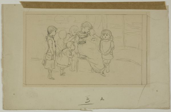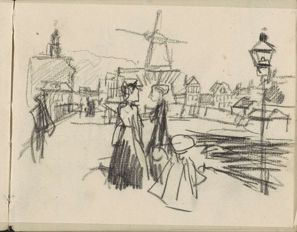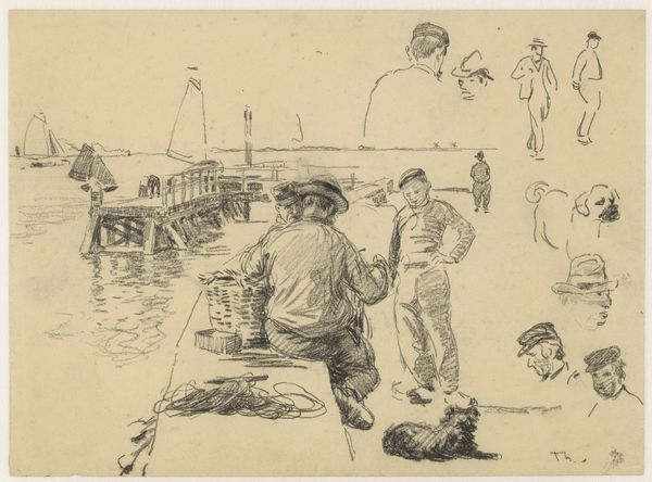 Editor: So, this is Theodore Roussel’s "Events Over the Railings, Chelsea Embankment," an etching from around 1888 or 1889. It’s at the Art Institute of Chicago. There's a slightly melancholic atmosphere, and it feels both intimate and distant at the same time. What strikes you most about its composition? Curator: What captures my attention foremost is the manipulation of line and form within the etcher's technique. Notice the delicate yet deliberate use of hatching and cross-hatching. This gives form to the figures, the railings and the cityscape behind them without resorting to strong tonal contrasts. Where would you say your eye is led first, and why? Editor: I'm drawn to the cluster of figures in the foreground. Their placement against the linear grid of the railing creates an interesting tension. It's almost like they are contained, observed. Curator: Precisely. Consider how the arrangement of these figures, along with the recessive planes established through line density, shapes the spatial dynamics. Observe also how the shallow depth contributes to the compressed quality of the picture plane. How might this flatness affect the viewer's understanding of the depicted scene? Editor: It pushes the figures forward, emphasizing their presence, yet simultaneously flattens the space, making it less about the scene itself and more about the formal relationships within the composition. It also calls attention to the surface quality of the print, almost as an object. Curator: A compelling observation! Focusing our attention on the formal elements opens possibilities for decoding the aesthetic intent. We learn the way shapes interact to form depth or the ways different weights of lines help delineate spatial arrangement. Editor: This close analysis has helped me see the thoughtfulness behind the apparent simplicity. It’s much more than just a depiction of a scene. Curator: Agreed. Now consider how further formal elements might affect its symbolic understanding.