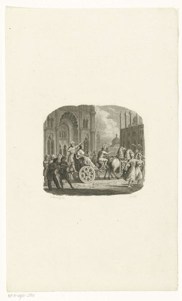 Reinier Vinkeles created this print of "The Beheading of the Engraver Cornelis de Hooghe" using etching. The print's most striking aspect is its composition. Vinkeles positions the execution stage centrally, against a backdrop of buildings, creating a theatrical space where justice unfolds. The stark contrast between the dark figures of the crowd and soldiers, and the lighter tones of the buildings behind, heightens the drama. The etching technique allows Vinkeles to articulate the scene with fine lines, detailing the architecture and the textures of clothing, as well as capturing the emotional tension of the moment. The work invites us to consider the power structures inherent in public executions and the engraver's ability to convey such a profound event through the graphic arts. By using precise lines, the artist directs our gaze to the emotional and social dimensions of 16th century justice.