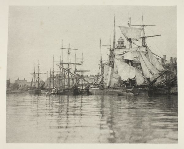 Peter Henry Emerson made this photograph, ‘On the Flood’, using a platinum print. This process, popular at the time, creates a soft, wide range of tones and a matte surface. Emerson championed photography as an art form. Here, he uses the camera to capture an everyday scene of labor on the water. The platinum printing process itself involved careful work. Light-sensitive platinum salts were applied to paper, then exposed to a negative. The print was then developed and washed. The final result mutes the scene, yet the workers in their boats are still visible. The process is unforgiving; dust or blemishes on the negative would show up in the final print. Emerson wasn't just pointing and shooting. He made choices about composition, depth of field, and printing to evoke a specific mood. He elevates the workers, the boats, and the scene to a fine art subject through his skillful manipulation of materials and photographic techniques.