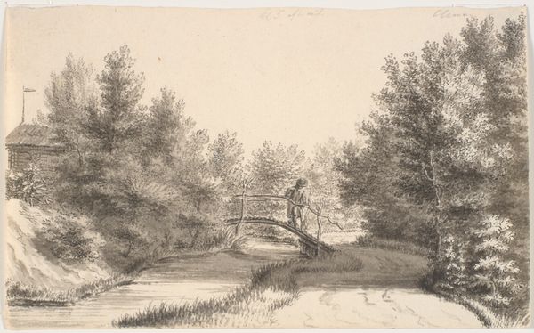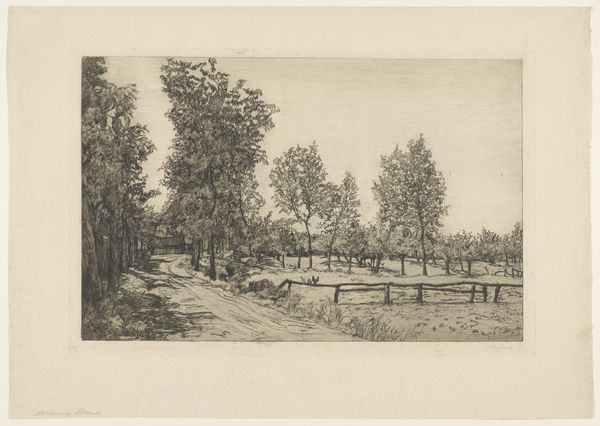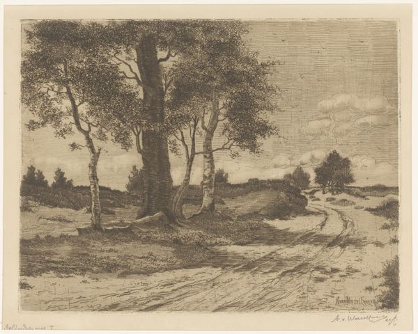 Curator: Looking at this landscape, I immediately feel a sense of quiet solitude, a hushed afternoon. Editor: You’re right. There's an interesting stillness. This etching by Adolphe P.H. J. van Weezel Errens is called "Landweg met bomen", depicting a country road with trees. Its creation is placed somewhere between 1876 and 1911. It’s part of the Rijksmuseum's collection. The way Errens has rendered the light... almost hazy, it creates such an intimate feeling. Curator: That light…it reminds me of memories half-formed, the edges of a dream. The road feels like a path inward, almost inviting you to get lost, or perhaps to rediscover yourself. Look at the subtle rendering of those birch trunks – their verticality contrasted against the implied horizontality of the landscape. Is this a reference to sacred groves in old folk beliefs? The threshold into another state of being? Editor: Van Weezel Errens was clearly captivated by the symbolic weight that landscapes can bear. Think about it – a road, such as the one featured here, signifies journey, progress, or even a divergence of choices, a crossroad in our life journey, especially during an extended time frame, the 1870s to early 1900s, a critical, transformational, time period for all. Curator: The technique, though... the delicate lines creating those vast spaces. There's something almost spiritual about its quiet simplicity. What's more beautiful, a literal translation of nature, or the artist's own internal experience that renders a work? It really invites that question, here. Editor: A powerful point! Consider how prints—etchings especially—enabled the widespread dissemination of artistic visions. “Landweg met bomen” encapsulates more than just trees and pathways; it reflects a societal and cultural memory. Curator: Yes! When an artwork offers an entry into yourself, and not just an entry into the world, there's an enduring impact that just moves people. Errens seems to offer an honest and direct entry into that space, through the landscape and, indeed, the trees, of the soul. Editor: A walk through an etching and the soul; I find that a refreshing point of view on Errens's rendering, an artist’s enduring vision brought to life.