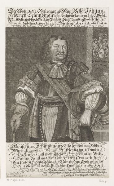 Editor: We’re looking at "Portrait of Johann Volland," an engraving dating from around 1648 to 1663, by Johann Pfann. I’m struck by how detailed the textures are, particularly in his clothing and the lace collar. It feels like the artist is trying to capture not just his likeness, but also his status and the spirit of the age. What are your initial thoughts on this portrait? Curator: This engraving offers us a glimpse into the self-assured world of the 17th century, doesn’t it? To me, Volland’s slightly world-weary eyes hint at more than the simple accumulation of worldly goods. The flowers on the table seem deliberately positioned there— perhaps he, or the artist, seeks to subtly indicate vanitas— the transient beauty of life. It is as if he might, in that split second before a modern camera clicks, actually *see* us looking at him. What kind of impression do you think his elaborate clothing and proud bearing were intended to convey? Editor: I suppose they were meant to show wealth and importance— the details of his clothing suggest careful attention and refinement, that sort of thing. I am curious as to how his profession as an apothecary affected his image. Curator: Indeed! You notice it, too, I suspect… Consider the tools of his trade subtly displayed on the table: he wishes not to be defined purely by riches, perhaps. What do you think of how light and shadow create a sense of drama and depth? Does that resonate with any other Baroque art we've seen? Editor: It's much like Rembrandt's use of chiaroscuro, where shadows emphasize certain elements to dramatize his portraits. Curator: Precisely! An excellent observation! It truly underscores how art transcends simple documentation to offer narrative and interpretation. Editor: It's amazing how much you can read into a single image. Thank you. Curator: My pleasure.