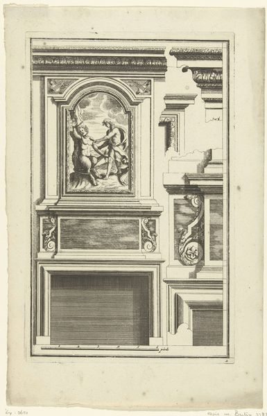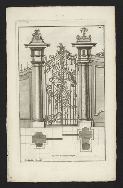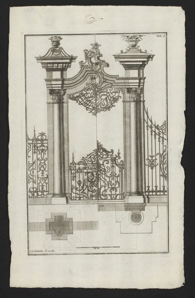This drawing presents a garden portal with ironwork, rendered in monochrome. The structure is meticulously planned with architectural precision, its effect both formidable and ornamental. Consider how this work explores the semiotics of space. The ironwork, though decorative, suggests a boundary, a threshold between spaces. It is a gate, an invitation but also a barrier. The columns and symmetrical design evoke classical ideals of order and control, reflecting the historical interest in rational design principles. The materiality, depicted through careful hatching, gives volume and depth to a space that exists only on paper. The artist uses line and form to destabilize fixed meanings of entry and exclusion. This drawing prompts us to consider how architectural elements function not just practically but as cultural signs that shape our understanding of space and access.
