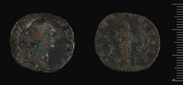Curator: Here we have a "Coin of Etenna," minted under Severus Alexander, currently held in the Harvard Art Museums collection. Editor: It's worn, yes, but the bas-relief portrait retains a surprising dignity. The patination really brings out the subtleties of the engraving, I think. Curator: Indeed, the imagery reflects a complex interplay of power and prosperity. Severus Alexander's profile, with the laurel wreath, signifies victory and imperial authority. Editor: And the figure on the reverse, though partially obscured by wear, appears to be a personification of abundance, with the cornucopia – a clear visual statement of economic well-being. Curator: Coins like these were not merely currency; they served as propaganda, disseminating the emperor's image and reinforcing the Pax Romana. They invoke a kind of visual shorthand for Roman values. Editor: The very materiality speaks volumes, doesn’t it? The coin's heft and metallic composition suggest solidity and endurance. The design gives it a sense of balance, even with the imperfections. Curator: It’s quite affecting to imagine this artifact passing through countless hands, each exchange embedding cultural memory. Editor: Agreed. Despite its small scale, it offers an expansive perspective on imperial ambition and the enduring power of simple forms.