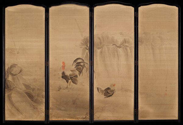 Editor: Here we have Banana Leaf and Goose, fusuma paintings on a pair of folding screens, traditionally attributed to Maruyama Ōkyo. I’m struck by how minimal the composition is. What do you see in this piece, considering its cultural context? Curator: It's fascinating how these screens, likely displayed in a domestic setting, subtly negotiated the public image of refinement. Notice how the artist uses empty space, a Zen influence, yet the banana plant itself alludes to imported, even exotic, knowledge and wealth. What does that tension suggest to you? Editor: So, the minimalist aesthetic actually conveys a complex status symbol? Curator: Precisely. It highlights how even seemingly simple images participate in constructing and communicating social hierarchies. Editor: I hadn't considered how an artist could use something like a banana leaf to speak about those hierarchies. Curator: It's a reminder that art isn’t created in a vacuum; its meaning is shaped by its context and reception.