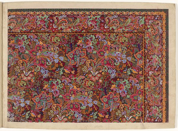Curator: My first impression is that the image almost vibrates with the intensity of the repeating forms. There's a controlled chaos to its design, a visual density that pulls you in. Editor: This is 'Ontwerp voor een tapijt', or 'Design for a Carpet', created anonymously between 1854 and 1864. Look at the interplay of shapes and colors, how the artist constructs visual rhythm with organic forms set within strong geometry. It is deceptively simple, and yet complex. Curator: Yes, the shapes are not only densely interwoven but layered in a way that echoes palimpsests of cultural memory, each form referencing earlier forms. Consider the central medallions. Editor: Absolutely. Medallions often signify power and divine protection in many cultures, don’t they? Here, those familiar, potent symbols seem deliberately disrupted. The formal layout fights for space with freer, organic motifs and bright chromatic tension. What visual stories might those choices reflect? Curator: Perhaps a tension between tradition and a new expressive artistic sensibility. It is fascinating how this negotiation can materialize so viscerally through the simple deployment of contrasting color fields. Do you feel the slight unease of color, so far removed from anything natural? The red particularly has a rather unsettling quality. Editor: Unease, or heightened excitement? These intense colors create dynamic relationships, propelling the eye. The lack of naturalistic coloring, for me, emphasizes the crafted, artificial quality of the carpet, directing focus toward the aesthetic considerations underpinning the choices in structure and arrangement. Curator: True, and considering that carpets serve as both utilitarian and ceremonial objects, perhaps those "artificial" colours deliberately signal a departure from mere practicality. Instead they herald an engagement with symbolism and communal aspirations, reflecting deeply rooted yet changing values. Editor: Thank you, it has been very stimulating discussing the carpet today, and it's surprising how rich a simple drawing for something as basic as floor covering can become on deeper contemplation. Curator: Agreed, observing this design unveils more than mere surface aesthetics; it presents a narrative rich with symbolic layers, illustrating an epochal push-and-pull between established cultural patterns and innovative impulses.