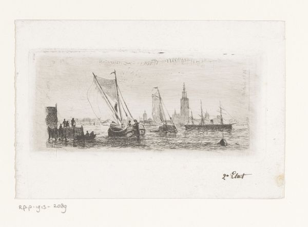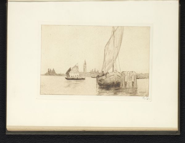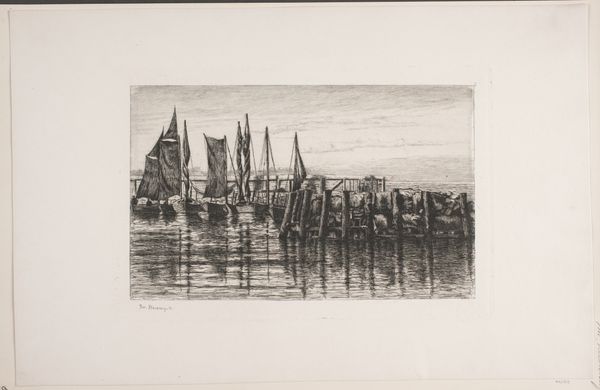 Max Kleinsorg created this etching titled, "Harbour Scene near Copenhagen" using blue ink to depict a cityscape dominated by the sea. The composition is structured by the interplay of vertical masts and the horizontal lines of buildings and the bridge. Notice how the artist uses dense clusters of fine, etched lines to create depth and texture, particularly in the water and the reflections, which adds a shimmering quality to the scene. Kleinsorg masterfully balances detail and simplicity, giving enough information to evoke a sense of place without overwhelming the eye. The limited use of colour enhances the print’s contemplative mood, typical of the aesthetic movements at the turn of the century. The reflections in the water mimic and slightly distort the forms above, offering a semiotic commentary on reality versus perception. It destabilizes the clear definition of objects and invites a deeper reflection on the nature of seeing. Ultimately, this work functions as a visual poem, where the formal qualities of line, tone, and composition combine to evoke a melancholic yet serene experience of the Copenhagen harbour.