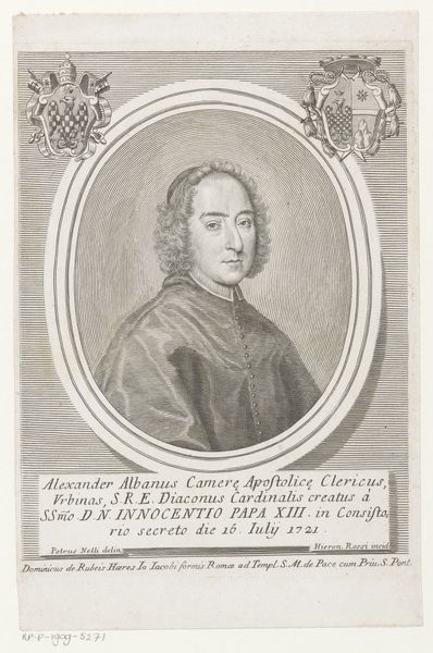 Curator: This is a print, "Portret van kardinaal Giuseppe Renato Imperiali," dating from between 1690 and 1762, housed right here in the Rijksmuseum. It's an engraving on paper by Girolamo (II) Rossi. The precision of the lines is incredible! Editor: Yes, I agree! It’s stunning to see how they captured so much detail, but what strikes me most is the contrast between the subject's serene expression and the quite rigid heraldic symbols. What story does it tell, do you think? Curator: Think about the means of production here. Engraving necessitates a specific kind of labor, a slow, meticulous process. Consider the materials themselves—paper and the metal plate—how does that interplay influence the final outcome? Furthermore, what's the social context of creating a printed portrait? Editor: Ah, I see. It's about reproducing images efficiently. Was this intended for the masses, making the Cardinal's image accessible, or was there a different type of circulation? Curator: Exactly! Who was the intended audience, and what power dynamics were at play? Remember, the consumption of these prints reinforces social structures and religious authority, reflecting on patronage, artistry, and social distinction through image circulation. Editor: That’s a different lens through which to see it – understanding the social function of reproducible portraits in Baroque society rather than simply appreciating the aesthetics of the image. I hadn't thought about the distribution network and its social implications before. Curator: Indeed. By focusing on the print's materiality and production, we gain a deeper understanding of its significance within the broader context of labor and social hierarchy. What do you make of the frame itself as another manufactured structure surrounding the portrait? Editor: Very true! It calls into question the artificial framing of individuals within specific societal roles. Thank you, now I look at art through its method and networks of creation rather than its message. Curator: Precisely. Exploring these material aspects provides a richer, more nuanced interpretation.