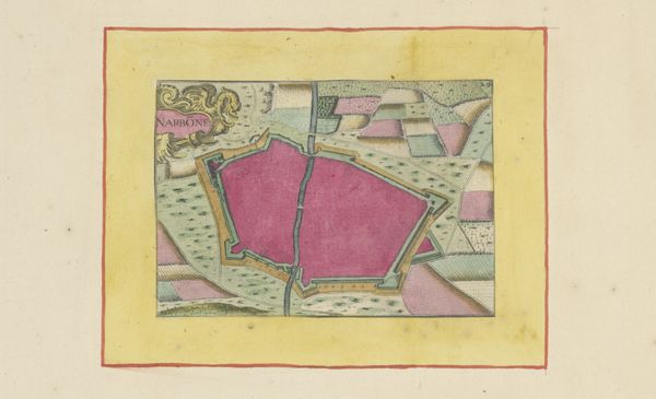 Curator: What a find. Today we’re looking at a drawing from 1638, “Plattegrond van Leucate.” It's an ink and coloured pencil drawing on paper. And, as the title suggests, it’s a city plan, or more accurately, a plan of a fortified city and its surroundings. Editor: It feels more like a daydream than a map. I keep getting drawn to the pink fortress. It’s perched so precariously, like a misplaced sugar cube on a rugged landscape. Curator: The pink definitely catches the eye. Considering this dates from the Dutch Golden Age, there’s probably a whole web of colonial power at play. Maps like these weren't just about knowing the territory, but about controlling it, claiming it. The level of detail gives us a sense of power over the landscape. Editor: Right, and the ships in the background imply a flow of resources and people, both voluntary and, much more likely, coerced. Still, I find something so charming about the naive rendering of the topography. It’s as if the artist were more concerned with conveying an *idea* of the place than its precise geographical reality. Look at how the hills just sort of roll into each other. It’s oddly comforting. Curator: Comforting until you consider the strategic function. These cityscapes were essential tools for military planning, which directly influenced urban design in the early modern period. It’s about legibility, defense, and ultimately, domination. Editor: I see what you mean. Even the seemingly gentle, rolling hills suddenly feel like strategic vantage points. It makes you wonder who this map was for, whose gaze it was designed to please. Curator: Exactly! And thinking about who *didn't* have access to this kind of information... the communities impacted, erased, or strategically occupied. Maps weren’t, and aren't, neutral documents. They're active participants in power dynamics. Editor: So much history, meticulously rendered. It almost feels too pretty to contain all that darkness, you know? Curator: Well, beauty can be deceptive, can't it? Maps invite us to dream, to explore… while often obscuring less palatable truths about control and access. Editor: A dreamy drawing, a bit dangerous. I'll certainly never look at a map the same way again.