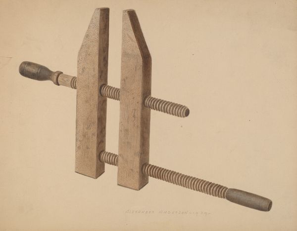 Editor: So this is George File's "Walnut Screw Clamp," made around 1937 with watercolor and pencil on paper. It's a straightforward image, but the subject matter feels unexpected, almost humble. What do you see in it? Curator: Immediately, I see more than just a tool. I see a representation of human ingenuity, a symbol of creation itself. A clamp holds things together, facilitates connection. Consider the spiral form of the screw thread – a motif echoed across cultures, symbolizing growth, evolution, the very helix of DNA. It subtly whispers about the hidden structures of the world. Editor: Interesting. I hadn't thought about the screw as a symbol. It seemed so… functional. Curator: Precisely. That functional aspect reinforces its symbolic power. In what ways is function beautiful? Ask yourself: what is held together? It might be the past and present or perhaps theory and practice. Think of the cultural memory embedded in woodworking, in craftsmanship. Each turn of that screw is a tiny repetition, a gesture repeated through generations. Editor: It’s a bit like those old paintings of workshops, but simplified down to just one tool. I'm now thinking about the history contained within even a simple object like this. Curator: Exactly. And File's choice to render this in watercolor lends a gentleness, a fragility. The image hints that creation requires delicacy as well as strength. It challenges us to re-evaluate the overlooked corners of our material culture. What does that clamped relationship enable, and what will emerge? Editor: I was expecting a straightforward technical drawing, but it's really a deeper reflection. Thanks, this really shifted how I see this clamp! Curator: My pleasure. The familiar can be made strange, and vice versa, and with the combination comes meaning.