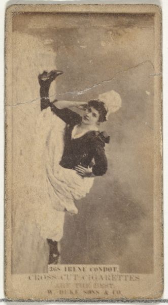 Curator: Let's consider this fascinating card, one in a series of actresses produced around 1890 by the Kinney Brothers Tobacco Company. This particular example depicts Allie Redpath. It's from the Actresses series (N245) and was issued to promote their Sweet Caporal Cigarettes. What are your first thoughts? Editor: I am immediately struck by the seemingly impossible pose—the theatricality of it all. There is such artificiality here that raises questions for me about the female body as a marketing tool during the late 19th century. It seems a complex blend of idealized femininity and commercial exploitation. Curator: Indeed. Tobacco cards like this were hugely popular; a cultural phenomenon, really. They served as a kind of miniature promotional poster, distributed widely. Kinney Brothers utilized photography and drawing in their printing processes to capture likenesses of popular actresses, like Allie Redpath, increasing their product’s visibility and desirability. Consider that these images circulated in a world before mass media as we know it today. Editor: The card seems to sexualize Redpath through the suggestion of movement; this isn't simply a passive portrait. Even though we understand that this portrait captures a mere instance of that potential movement, to see a woman represented in an active rather than a stationary position speaks to the period's cultural interest in the performance, commodification, and ultimately the possession of feminine vitality. And who gets to do what with whose body in capitalism. Curator: Absolutely. Furthermore, consider that Redpath and other actresses became known as commodities through cards like this. It helped popularize them but simultaneously situated their image as something to be collected and traded, effectively objectifying their identity in ways that directly promoted consumption of Sweet Caporal cigarettes. These actresses represented an evolving ideal that fueled cultural desire and tobacco sales simultaneously. Editor: Precisely. Seeing Redpath's image reproduced and disseminated through this kind of commercial distribution has unsettling resonances to today’s ubiquitous media imagery, suggesting enduring links between women’s representation, consumerism, and commodified identities. Looking at this raises crucial questions about how little some systems have evolved. Curator: Certainly, thinking about the card and what it might reflect about evolving concepts regarding commercialized portraiture really shifts our understanding. Thanks for providing those insights. Editor: Thank you; those points certainly added new layers of complexity to my initial views.