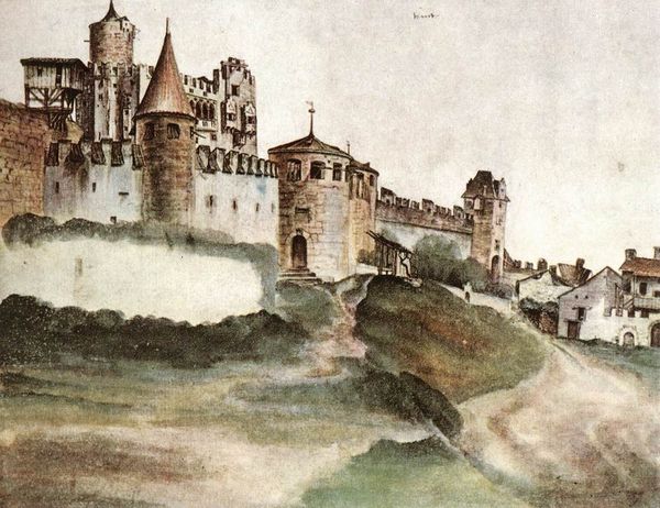 Curator: Nicholas Roerich, a fascinating figure drawn to mysticism and history, painted this tempera and watercolor, titled "Viking's Tomb" in 1908. Editor: Tomb, eh? Feels less like a mournful resting place and more like a formidable castle braving a storm! The color palette is restrained—almost monochromatic—but creates this incredible atmosphere. Curator: Yes, Roerich certainly infuses it with a sense of epic grandeur. The symbolist elements draw us in; notice the stark architectural forms against the dramatic seascape, it really emphasizes the human spirit's capacity to create lasting testaments even against nature's immense force. The cliffs feel ancient. Editor: The almost severe geometric shapes give me the chills, frankly. It's imposing, almost arrogant. And yet, that tiny figure near the cliff edge… it makes me wonder who rests there? Is it a celebration of power or a meditation on mortality? And the tomb, maybe it has served multiple uses! Curator: Excellent observation. Symbolism is intentional, not explicit. Consider the color choices as well—the muted blues and greens which were frequently associated with spiritual yearning or even melancholy in symbolist art circles, setting that pensive mood. This also resonates with broader symbolist themes of escapism, the yearning to connect with something beyond mundane. Editor: I see, like peering into a fading myth. Though, to be honest, if I was a Viking, I’d ask for a burial at sea! Curator: Ah, perhaps it is more symbolic of a state of being. A permanent memorial to an ideology or worldview rather than a body. What lingers is that Roerich uses architecture to represent something ethereal; he collapses interior, psychological states onto the physical, external world. Editor: The world, as a psychological reflection! I suppose Vikings could get behind that, especially on a really turbulent day! Well, that was certainly thought-provoking. Thank you. Curator: A most worthwhile discussion; these multilayered explorations ultimately enrich the experience and ensure art's legacy is sustained with renewed perspective!