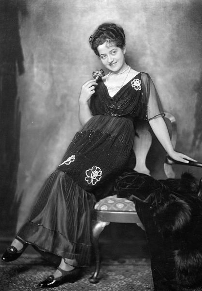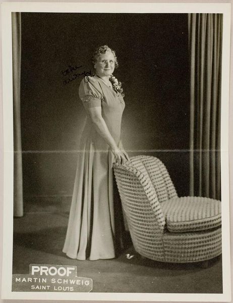 Curator: This is an untitled proof print by Martin Schweig, showcasing a woman in an elaborate dress and large hat. It's part of the Harvard Art Museums collection. Editor: Oh, she looks trapped, doesn't she? The dress, the hat, it's all so... overwhelming. Like a beautiful cage. Curator: It’s fascinating how fashion dictates such strong visual codes. The dress is certainly a statement, perhaps reflecting the social expectations placed on women. Editor: Absolutely. It's a performance, isn't it? The veil, the bouquet – every detail speaks to a role she's expected to play. I wonder what she's really thinking behind that composed face? Curator: Proof prints, especially portraits like this, give us a peek behind the curtain. They remind us that even posed images are constructed realities, subject to revision and interpretation. Editor: Right! And maybe, just maybe, in her quiet gaze, there’s a hint of rebellion, a whisper of her true self resisting the heavy costume. Curator: Maybe. Or perhaps it's simply the quiet dignity of a woman facing her future. Food for thought, either way. Editor: Indeed. Thanks for that glimpse of the past.