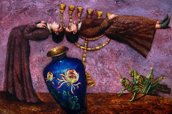 Dmytro Kavsan made this “Tempting Still Life” painting at an unknown date using I guess some kind of oil-based paint. You know, it’s funny, I’m not usually that into still life, but this one has something. I mean, look at how Kavsan has placed this stuff on the table. The brushwork is kind of all over the place, kind of haphazard. The way the paint is applied, it’s like everything is in flux. I like the kind of silvery, shimmering light he’s got going on. Like the objects are lit from within. And the little people! Are they falling? Flying? What’s going on? For me, that’s what paintings are all about: not just representing things, but getting at something deeper, a feeling, a mood. It reminds me a little bit of Chaim Soutine. He used a brush with very thick paint. You know, he really went for it, even if he got a little bit messy. Anyway, maybe I’m projecting here. But that’s okay, right? That’s part of the fun of looking.