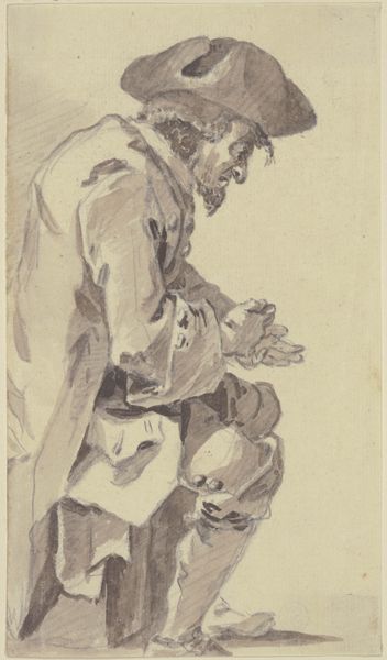 Jan van Noordt made this drawing of a standing man with a stick in his left hand with chalk on grey paper in the mid-17th century. In 17th-century Dutch art, the representation of everyday life and ordinary people became increasingly prevalent, reflecting the cultural values of the time. Van Noordt's drawing captures this interest, showing a figure who seems caught between classes, indicated by the beggar's sack over his shoulder and bare feet. The upward movement suggested by the staff and forward-leaning pose may represent the social mobility that characterized the Dutch Golden Age. However, this representation exists within a complex historical context. While the Dutch Republic experienced economic prosperity, significant disparities persisted, and images like this one may also hint at the struggles faced by many. The man's gaze toward us creates a moment of recognition, bridging the gap between the artwork and the viewer and prompting reflection on societal dynamics.