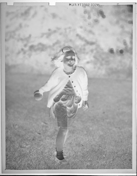 Curator: This photographic print, currently titled "Untitled (portrait of a child in 'Buster' hat)," comes to us from John Deusing and the Harvard Art Museums. The image measures roughly 7 by 5 inches. Editor: It has a ghostly quality, stark tonal contrasts emphasizing the subject’s face and the peculiar outfit. Curator: Indeed, this print reveals a child costumed, perhaps for performance or play, a Buster Keaton-esque hat atop their head. It makes me wonder about the social role of children and the clothing industry involved in creating such novelty items. Editor: The composition directs our eye immediately to the face, the hat’s inscription acting as a focal point balanced by the dark bow tie. What of the textures—the soft hat contrasting with the rigid formality of the clothing? Curator: Excellent point. It underscores the performative aspect, blurring the line between childhood innocence and manufactured identity through the available material goods. Editor: Considering the tones, the textures, the pose... it's a fascinating study. Curator: Agreed. A small image offering significant insights into childhood, commerce, and persona.