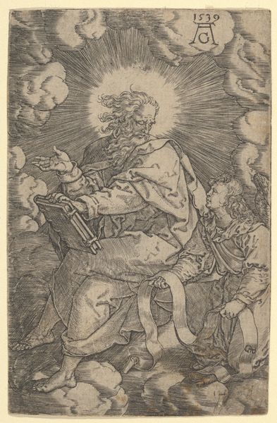 Editor: This engraving, titled "Marcus," was created by Heinrich Aldegrever in 1539. It’s at the Rijksmuseum. The amount of detail is really impressive, especially considering the limitations of the engraving medium. The scene feels... both serious and a little dreamlike? What do you make of it? Curator: Ah, yes, Aldegrever's "Marcus"! Doesn't he look like he's writing a heavenly memo from HR? Look at the intense concentration etched onto his face. And those feet! Delightfully unidealized, poking out from beneath his robe. The clouds cushion him, and then that roaring lion! A touch of whimsy alongside the weighty intellectual labour, wouldn’t you say? But I also wonder about the date... 1539... just as the Reformation's winds were really whipping through Europe. Does that give you any ideas? Editor: Hmm, maybe the intensity comes from that religious and political context? Is Marcus a reference to the gospel writer? Curator: Exactly! And remember, the Reformation emphasized individual interpretation of scripture. Perhaps Aldegrever is showing us Marcus not as some untouchable saint, but as a thoughtful, even slightly cranky, scholar grappling with important ideas. See how grounded and human he appears? Now look at the radiating lines surrounding him, almost a halo, but more geometric and… well, regulated, organized. The contrast strikes me, doesn't it? Editor: Yes! That controlled halo next to those very human feet. It’s like Aldegrever is playing with these opposing ideas. It really complicates how I see the piece. Curator: Isn’t it lovely? I find it both reverent and just a tad irreverent, much like faith itself can be, and frankly should be if it’s worth its salt! The more I look, the more human truths I see tucked into its details. What a feat of perspective on the man, his context, his beliefs, the lion, and all that fuzz! Editor: I'll definitely be thinking about the Reformation differently now! It’s amazing how historical context changes the experience of art.