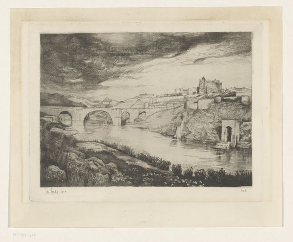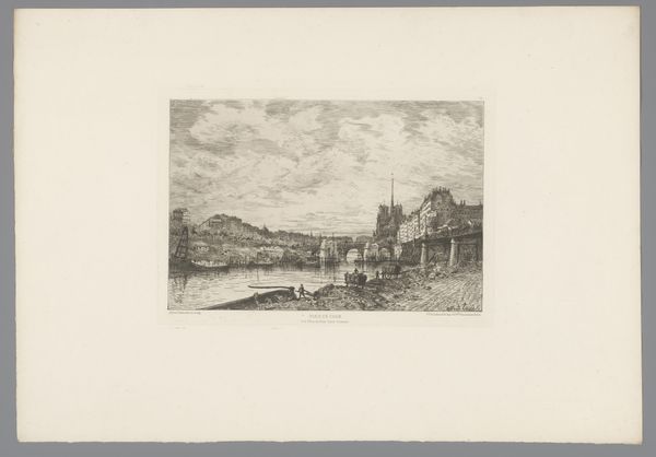 This is Willem Adrianus Grondhout’s etching of a bridge over the Seine in Paris. Etching is an indirect process, which uses acid to bite into a metal plate. The etcher covers the plate with a waxy ground and then draws an image with a sharp needle, exposing the metal. The plate is then submerged in acid, which eats away the lines where the metal has been exposed. The longer the plate sits in the acid, the deeper the lines become. Once the ground is removed, the plate is inked and then pressed onto paper. Here, Grondhout’s manipulation of the etched line is key to the image: its fineness gives a delicate atmospheric effect that softens the monumental architecture of Paris. This process allowed for the relatively quick and efficient reproduction of images, meeting a growing demand for visual representations of city life during the modern era. The artist has thus given us not just an image of Paris, but a portrait of its industrialized visual culture.