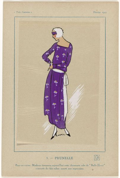 Curator: Looking at this artwork, entitled "Bagdad" by Erte, I'm immediately struck by its air of exotic elegance and high fashion. Editor: Exotic is right. It's like looking into a gilded dream. The color palette sings—a bold yellow balanced against these moody grays. And the pose...so stylized, like she's gliding on a silent film screen. What’s this rendering, some kind of ink drawing, isn’t it? Curator: Yes, Erte worked often in ink and gouache, producing designs like these for magazines like Harper’s Bazaar. These drawings became synonymous with the Art Deco aesthetic, representing an escape from the trauma of World War I into a world of fantasy and luxury. Editor: Luxury definitely drips off every carefully placed line. I keep wondering about the woman in the drawing, though. Is she real or imagined? The dress and headwear suggest some historical reference…or perhaps some theatrical performance of what was seen as 'exotic' at that time? Curator: Precisely! It's important to consider how "Bagdad," as envisioned in Western cultural imagination, carries heavy orientalist undertones. While celebrated for its decorative qualities, this image reinforces stereotypical portrayals. It romanticizes a foreign "other" for Western consumption. The image tells us less about the place than it reveals about Western attitudes. Editor: I see that now. There's that delicious tension between sheer aesthetic pleasure and historical awareness. Knowing all this casts such different shadow over it! Still, you can't deny the artwork still retains its aesthetic power, it's ability to dazzle! What should our listeners really think about when stepping away? Curator: To consider that art and culture are embedded in layers of socio-political history. Even the most exquisite artworks carry legacies we need to carefully evaluate and understand. Editor: And me? I just will go away trying to imagine who really inspired Erte while crafting this historical drawing. I wonder if somewhere in the streets of Baghdad a yellow silky dress like this actually danced.