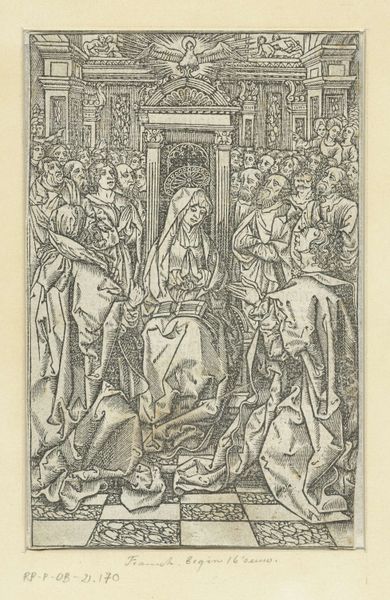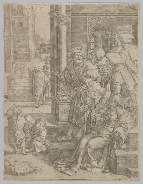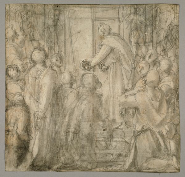 Editor: This ink and charcoal drawing is by Jan van der Straet, created sometime between 1523 and 1605. The title is quite a mouthful: *S. Giovanni Alberti Fiorentinos historie. Helgenen anklager p\u00e5 torvet biskopperne af Firenze for simoni(?)*. The drawing feels very busy, with all these figures clustered together. The lines seem very expressive, but also a little chaotic. What is the key element of visual interest for you in this work? Curator: From a formalist perspective, what immediately strikes me is the use of line to create depth and movement. Notice how the artist employs varying line weights to distinguish between foreground and background figures. The darker, more defined lines in the foreground create a sense of immediacy, drawing the eye to the central figures and the accusation taking place. Then, observe how the artist uses hatching and cross-hatching techniques, building up tone and volume with great sophistication in such a monochromatic palette. Do you see how these structural decisions guide our reading of the image? Editor: Yes, I can see that. It’s almost like the figures in the background are fading away, giving a real sense of perspective, and making the foreground action really stand out. The strategic placements of hatching and line work is clear, and really compelling now that you've explained it. It does draw the eye toward the tension and conflict shown on display. I hadn't thought about it that way. Curator: Precisely. The density of line work isn't random, but deliberate. Each element works to create not just representation, but the emotional tenor of the scene. Look how the architecturals and colonnades also serve as horizontal lines, countering the motion in the group to further add emphasis to Alberti. Ultimately, the tension isn’t merely in the historical narrative but woven within the aesthetic framework. The overall visual organization guides our interpretation as much as any story the piece tries to tell. Editor: That's a different approach to what I expected, I had only focused on the characters initially! Thank you! Curator: It highlights how even within historical depictions, formal considerations such as line and composition fundamentally mediate our perception of the depicted subject.