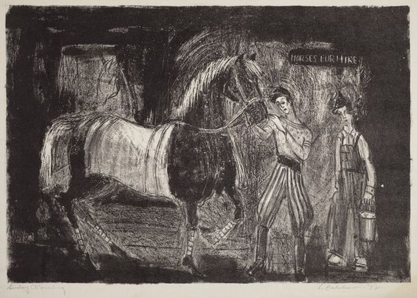 Curator: Right, let's talk about "Domestic Life - 3800 Level - Empire Mine," a 1935 graphite and pencil print by Ray Boynton. Editor: Woah, instantly, I'm getting such a heavy mood. Everything’s draped in shadow, and there’s this mule, standing so still…almost ghostly, don’t you think? Curator: The image certainly possesses a somber tone. The scene captures an interior of a mine, possibly a stable or holding area, complete with a mule, equipment, and even a cat dozing in the lower corner. Editor: A cat! Missed that the first time, a small comfort amidst all the bleakness. Still, it’s that mule that gets me. It looks exhausted, resigned maybe? All the crisscrossing lines in the pencil work feel like…bars. Curator: Mules served as indispensable components of the mining operations, and the cat hints at some sort of attempt at creating a homelike setting, perhaps hinting at warmth within harsh, almost inhumane labor. The presence of the cat introduces an icon of comfort, resilience and ordinary life into the dark, subterranean realm. Editor: So you’re saying it’s not just about depicting a place but evoking a feeling about the life *in* that place. Even the title is a bit sarcastic – "Domestic Life" at the 3800-foot level of a mine? I mean, what a juxtaposition. Curator: Exactly! Boynton captures the spirit of the time. The realism feels stark. Notice how light plays—or rather, struggles—across every surface. It creates a sense of depth, making the mine feel even more vast and echoing. Editor: It makes me wonder what Boynton intended to say with it. Was he romanticizing the miner's life or perhaps throwing shade at it? It's oddly affecting, like looking at a memory half-forgotten. Curator: That ambiguity adds to the work’s complexity. Perhaps Boynton aimed to provoke reflection on how industry encroaches into life. Editor: Definitely food for thought, as bleak as it seems. Curator: Yes, a simple image but one full of historical and emotional complexity.