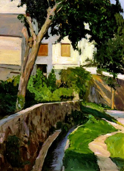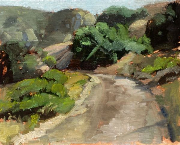 Dan Graziano painted the South Pasadena Public Library in an oil on canvas. The structure of the building, while central, is framed by the organic forms of trees. This contrast highlights the tension between man-made architecture and the natural world. Graziano's brushstrokes are visible and expressive, creating a textured surface that captures the light and shadow. The dark pillars give way to the lighter, white walls which create an interesting play with perception. The light palette contributes to the overall sense of warmth and serenity. The strategic placement of the architectural and natural elements, as well as the application of light, suggests an ongoing negotiation between order and chaos. This artwork does not merely depict a scene but actively destabilizes our understanding of how these elements interact within visual space.