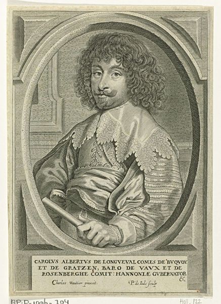 Curator: The first impression I get is...powerful. Stern, almost. Look at those lines; they carve out such a resolute figure. What do you see? Editor: You know, that steely gaze just reinforces established authority for me, especially combined with the Baroque framing. It really speaks to a particular kind of inherited privilege. The inscription tells us this is Carolus de Longueval, Governor of Hainaut... it is important to note that Longueval was the commander of the imperial army that conquered that territory. Curator: Ah, always with the context! But you're right, knowing who he was does color things. But purely visually, even divorced from that, don’t you find the rendering impressive? The textures, the way light catches on the armor? Editor: Definitely, and it's interesting that you mention the light reflecting off the armor because in this time of imperial control it is easy to fall into romanticizing the Baroque era, or focusing only on the technique and light; and that would be easy to do in ignoring the brutal power structures at play here, right? Curator: Very true. You remind me how we have to recognize whose stories are being told, and whose aren’t, right? Editor: Precisely. The artist, Pieter de Jode the Younger, worked in Antwerp during a tumultuous period, so this isn't just a portrait; it’s a strategic image. How does a ruler want to be seen by those conquered by their governance and reign? Curator: So it's more than just lines on paper. And to create this effect using solely engraving… Incredible discipline and planning to achieve that richness of tone. What do you walk away with? Editor: Longueval in armor stares from the page, forever embedded within this context, but perhaps made accessible by virtue of art itself... Curator: For me, it’s the stark contrast. Brutal power depicted with incredible refinement, all rendered in monochrome. There’s a somberness that's both alluring and… unsettling, as you note, the very definition of Baroque tensions.