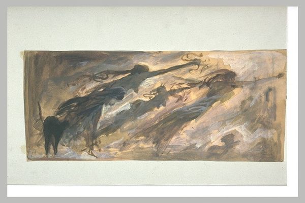 Curator: Oleg Holosiy's "Centaur," rendered in oil in 1989. What strikes you immediately about this canvas? Editor: Its restless energy, the way the blue-grey tones wrestle each other, suggesting some elemental, barely controlled force. It's a somber take on the centaur myth, a world away from classical serenity. Curator: I agree. It departs from conventional imagery. In terms of symbolism, beyond the obvious association with raw power and instinct, I think of the centaur as an archetypal image of duality—reason versus impulse. What do you read into the brushwork and palette? Editor: There's a wildness, even crudeness to the application of paint that pulls me. It’s almost as if Holosiy wanted to undo any prettiness. And the palette – largely monochromatic—creates a sense of something ancient being dredged up from the subconscious. Curator: Exactly! It feels unearthed rather than born of some graceful inspiration. To my eyes, there are hints of decay—a world-weariness about this mythical beast that makes it poignant, despite its imposing presence. He renders the centaur neither idealized hero, nor terrifying monster, but something tragically in-between. The ghostly markings on its shoulder make me think of an insignia, perhaps of some forgotten tribe. Editor: That insignia feels less like a marking and more like a scar in my eyes, contributing to this sense of pathos, like a brand of slavery and constraint. Curator: Holosiy's work often deals with these undercurrents of longing and fractured identity, explored through fragmented forms and stark palettes, but also raw emotional exposure. Editor: Exposure feels like the right word. This isn't a celebratory myth. It's a stripping away. Curator: It challenges us, I think, to confront the more unsettling aspects of human nature reflected through the mythical. A powerful image indeed. Editor: Leaving you haunted, wondering what the cost is for carrying dual burdens: both beast and human.