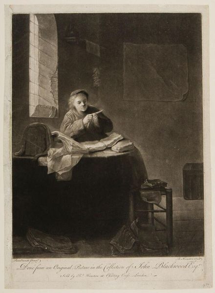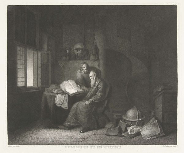 Curator: This is "Philosopher, Meditating," a fascinating print by Lambert Antoine Claessens. The scene is dominated by the play of light and shadow. What strikes you first? Editor: The gloom, definitely. It feels like the philosopher is deliberately shutting out the world to engage in some serious, solitary work. Curator: Notice the window, though, a clear symbol of enlightenment and knowledge, counterbalancing the dark. And then there is the second figure, maybe an angel or perhaps another aspect of the philosopher. Editor: True, but the globe and scattered papers speak to a tension. Is it the weight of knowledge or the burden of thought that keeps him hunched in the shadows? Curator: Perhaps it suggests that even with intellectual tools and divine insight, one can still be consumed by the human condition. Editor: I see the appeal of that interpretation. The image can be viewed as a comment on the isolation inherent in the pursuit of knowledge. Curator: Claessens has created an image that resonates, a powerful depiction of intellect wrestling with itself. Editor: It's a timeless visual study of contemplation, but maybe also a cautionary tale about its isolating effects.