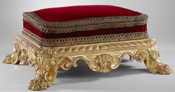 Curator: My goodness, look at the way the light plays on that gilding! It feels… theatrical, almost like a gilded cage ready for a grand performance. Editor: Indeed. What we have here is a baroque-style settee, made sometime between 1725 and 1735. It's currently housed here at The Metropolitan Museum of Art and crafted by the English furniture maker, Benjamin Goodison. Curator: "Crafted" feels almost too… reserved. More like conjured! The red cushion is like a drop of blood against all that ostentatious gold. I wonder, were conversations on this settee whispered or shouted? Did it witness grand pronouncements or scandalous secrets? Editor: Well, such settees were undoubtedly status symbols in the 18th century. Patrons used such objects to project an image of power, prosperity and cultivated taste. This particular settee with all the carving of foliage and shells speaks to the Baroque tendency to want to overwhelm through detail. Curator: And look at those claw feet. Regal beast feet! There's such a primal energy contrasting with the refined elegance. Like the wild heart barely contained beneath the finery. I picture someone nervously fidgeting on it, trying to seem composed when, really, their inner lion wants to leap out. Editor: The lion as ornament is entirely intentional. Displaying exotic animal motifs signalled a knowledge and, by implication, control of the wider world to contemporaries. Goodison understood these associations, catering to a aristocratic clientele with the capacity and desire to impress. Curator: I find that interesting because the artisan's hand is really showcased by every curve and flourish, a reminder that such outward display rested on skillful craft behind the scenes. I keep coming back to that intense, intimate red against the all that bombast. Editor: Absolutely. Ultimately, even now, after all these centuries, its visual presence can spark ideas around ideas about hierarchy and artistry, power and imagination. Curator: I agree. The seat still sparks conversation.