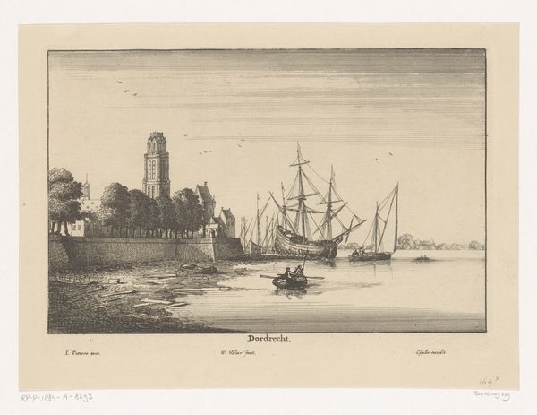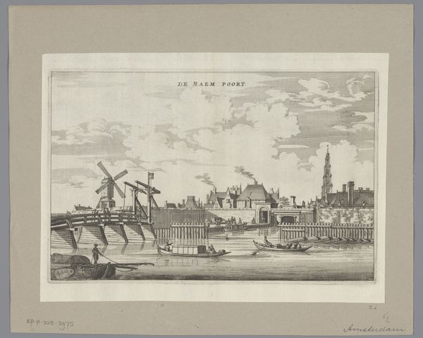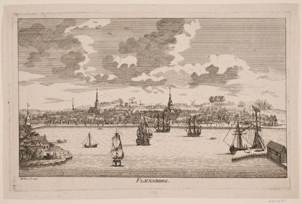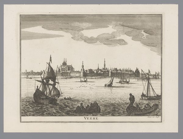 Editor: This print, "Gezicht op het buitenhuis Boa Vista," from around 1671, is attributed to an anonymous artist and done with etching. The details are just incredible, even the clouds. What strikes me most is how the artist managed to create so much depth and space with simple lines. What compositional choices do you notice? Curator: Indeed, observe how the linear perspective directs the gaze. Note the strategic arrangement of forms—the prominence of the ship, counter-balanced by the building and the pier in the middle-ground, establishing depth. Also, note the repetition of vertical lines and shapes that generate a consistent rhythm. Editor: The way the buildings and the boats are rendered - how does that contribute? Curator: Look at the formal relationships at play. See how the geometrical shapes of the central building are offset by the less rigid forms of the ships. This interplay enhances visual complexity while ensuring a balanced and organized structure. Editor: I never would have picked up on those shapes. I’m so used to looking for what an artwork *represents*, not how it’s built. Curator: Exactly. Forget, for a moment, about the narrative elements. Instead, appreciate the intricate lines defining the boats, their rigging mirroring the architectural details of the building. This repetition guides the viewer's eye through the entire composition, revealing layers of geometric artistry and spatial precision. What do you make of it? Editor: I see what you mean! Concentrating on the purely formal elements almost creates an abstract composition within the landscape. It's not just *what* it is, but *how* it is that matters. Thanks so much for clarifying all this!