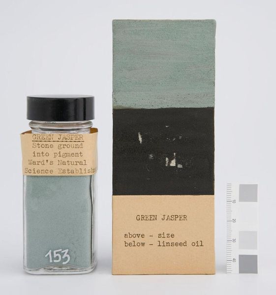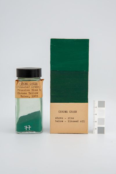 Editor: Here we have "Cobalt Green (Zinc Green) Cobalt Oxide and zinc oxide" manufactured by Madderton. What strikes me is how this simple color sample evokes questions about industrial history and artistic practice. What do you make of it? Curator: It’s a fascinating artifact, isn't it? The clinical presentation—pigment in a jar, application with and without linseed oil—speaks to the commodification of art. The label itself becomes a commentary on consumerism and the accessibility of art materials. How does the idea of manufactured color impact your understanding of artistic expression? Editor: I hadn't considered the consumerism aspect so directly. It reframes the artist's agency, doesn't it? Curator: Precisely. It invites us to consider who controls the means of artistic production and how that shapes what art is made and who gets to make it. Editor: I see, it's not just about the color itself, but about the system that produces and distributes it. Curator: Exactly. It transforms a simple pigment into a potent symbol of larger social and economic structures. Editor: Thanks, that gives me a lot to think about regarding materiality and artistic agency.