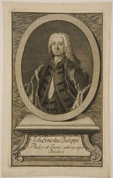 Curator: This engraving presents a portrait of Christian Wolff, dating sometime between 1763 and 1804, by Carel Jacob de Huyser. What strikes you about it initially? Editor: Well, the texture is fascinating. It’s the type of work where I find myself immediately wondering about the engraving process, imagining the labor that went into all those meticulously etched lines. Curator: Exactly! As a print, the process of production is central. This wasn’t a unique object, but part of a potentially large edition. Its creation and dissemination are as much a part of the story as the subject himself. Think about the engraver's skill in translating form into line and the societal demand that fueled such portraiture. Editor: True. Considering the historical context, the engraving likely served as a form of accessible portraiture, disseminating Wolff's image within intellectual circles and beyond. Wolff himself, with his philosophies and influence, shaped institutions of higher learning, his persona almost a brand in his time. How was it to reach wider audiences then? Curator: I see your point, but the texture and form are integral. Look closely at the way the engraver used different densities of lines to create areas of light and shadow, mimicking the appearance of painted portraits, for instance. Editor: The way the background curtain and bookcase are rendered—almost overwhelming—really tells us something. This wasn't just a likeness; it was a constructed image meant to convey status, intellectual heft, almost an aura of established power. It reveals so much about 18th-century ideas about who mattered and whose image deserved widespread distribution. Curator: Indeed. Every single mark on that plate was a deliberate choice in a socio-economic structure which defined its production. Even its potential use - as perhaps a frontispiece or to commemorate someone’s works adds meaning. Editor: So, it’s a portrait but also a symbol of an era and of the social forces determining art production and appreciation at that time. An image created through deliberate labour reflecting existing social norms. Curator: Precisely, understanding both informs a richer engagement with the object.