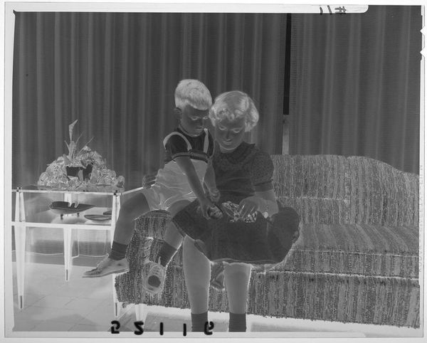 Curator: Here we have an intriguing snapshot, Untitled (two children in high chairs), by Lucian and Mary Brown. The print measures a modest 10.16 x 12.7 cm and resides in the Harvard Art Museums. Editor: It’s immediately striking – the stark tonality combined with the domestic scene creates such an interesting tension. Curator: Exactly. The lack of information surrounding the Brown’s practice invites speculation. Are they documenting a social trend or capturing private family moments? Editor: The children themselves command attention. Look at the details in their high chairs, the molded plastic contrasting with the plant stand. Curator: The mundane elevated. Perhaps the Browns were interested in democratizing the photographic medium, bringing it into the sphere of everyday life, blurring the lines between amateur and professional. Editor: I agree. It makes you consider the material conditions of their lives and how that shapes the narrative within the image. Curator: Indeed, seeing these babies in monochrome sparks a reflection on what we expect from family portraits. Editor: Yes, it goes beyond the image itself to the social role of parenting at the time.