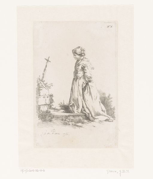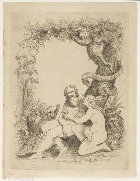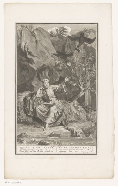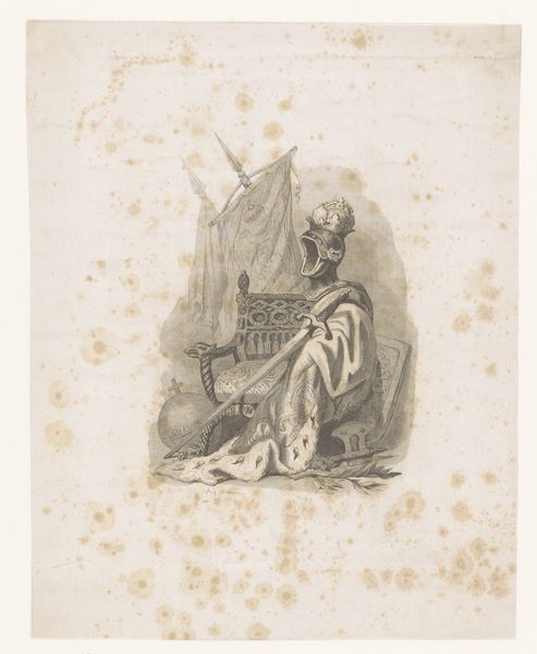 Curator: Let's discuss "King with a Peacock," a print crafted by Heinrich Vianden in 1844 using pencil. What strikes you initially? Editor: It feels whimsical, yet melancholic. The lines are so delicate, almost fragile. The King appears regal, of course, but also quite isolated, overshadowed almost by the peacock. Curator: It’s intriguing how Vianden merged historical and allegorical elements. Consider the material process; the transfer of the initial pencil sketch to print suggests accessibility and potential for wider dissemination. What commentary might that provide on ideas of royal power during a period of emerging print culture? Editor: Visually, I'm drawn to the contrast between the heavily patterned robes of the King and the feathery extravagance of the peacock. The details pull the eye around the artwork—did the peacock symbolize vanity? What sort of man poses beside that particular avian figure? Curator: Precisely. And look closer. Behind the King, a crowd seems to observe. The labor behind depicting those textures would have been significant. Considering Romanticism, we must consider the audience and marketplace for the artwork—prints such as this offered both information and aspirational imagery during a period of immense industrial change. Editor: I hadn’t thought of that, focusing more on this composition—its lines. Yet, I see that Vianden used very spare pencil strokes to set out the backdrop figures and buildings behind the king and his symbolic peacock. It keeps our eye locked to the main subjects through artistic skill. The way the angel almost seems a dream conjured from the king's own ambition? The very process and choices Vianden took create this interpretation. Curator: The medium itself affects our response— the sketch-like aesthetic diminishes the authority typically linked to a regal subject. Editor: Ultimately, for me, this work showcases art’s potential for revealing multifaceted humanity—in power, in pose, in production. Curator: Indeed. A compelling glimpse into the complex relationship between power, image, and artistic labor of the period.