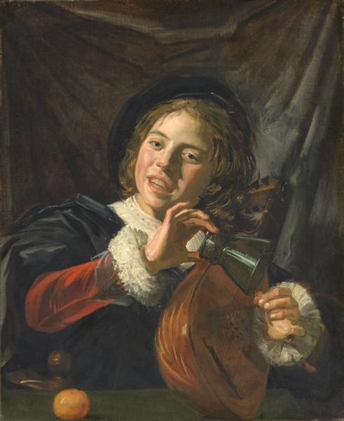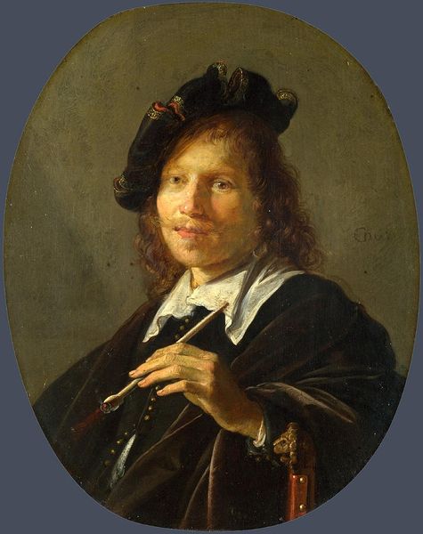 Editor: Here we have Jan Miense Molenaer's "Self-portrait" from 1640, rendered in oil on canvas. I find myself drawn to the almost theatrical presentation. What strikes you most about this piece? Curator: Immediately, I’m compelled by how Molenaer presents the very act of artistic production and its cultural position. The overt display of a skull, the book, even his opulent clothing... they are not merely symbols, but signifiers of material wealth, labor, and intellectual capital within the Dutch Golden Age art market. He isn’t simply portraying himself; he's displaying a constructed persona designed for consumption. How do you perceive the role of "vanitas" elements here? Editor: I see the skull as a traditional reminder of mortality. Are you suggesting there's more to it than just that? Curator: Exactly! The skull isn't merely about death; it is about its commodification within painting itself, an almost self-aware acknowledgement of art's power to grapple with philosophical concepts as desirable, sellable objects. The materials – the costly pigments, the canvas itself – required resources and specialized labor. Editor: That's a fascinating angle! It almost feels like he's winking at the viewer, acknowledging the transaction. So, would you say the very medium becomes the message in this context? Curator: Precisely. It reveals a dialogue between artist, patron, and the market— the economic machinery driving art’s creation, purpose, and, frankly, its social life. He uses conventions, but complicates them through a consciousness about how his materials become intertwined with cultural significance and value. Editor: I hadn’t thought of it that way before, focusing on how it shows not just the subject, but also the system surrounding its creation. Thanks, that offers so much more insight. Curator: Gladly. Looking closer always unveils complex truths about cultural labor, and that's something art relentlessly delivers.