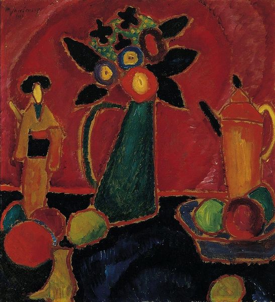 Curator: Henri Matisse painted "Tin Pitcher, Lemon and Armchair" in 1939. Looking at it now, I am struck by its curious stillness; almost oppressive. Editor: Yes, it's quite striking. Matisse really emphasizes line and color here, creating a very self-aware composition. Notice how the cool whites and silvers of the pitcher play against the acidic yellows and reds? Curator: The lemons jump out, don't they? But the armchair lurking behind seems to cast a long shadow –literally and figuratively. It feels to me almost like a premonition of the impending war, even in this domestic scene. Like something sweet is about to turn sour. Editor: That’s interesting. I interpret the armchair more formally; it seems Matisse used the broad red line as a visual device, anchoring the eye and contrasting with the vertical rhythm of the pitcher. The tabletop creates a dialogue between pattern and plainness. Curator: True, but the dots themselves are disruptive – they unbalance the composition, much like the unsettling nature of reality. It might point toward the privilege of leisure, undermined by what the rest of Europe was confronting in 1939. Even still life, then, becomes inherently political. Editor: Perhaps. The way he flattens space certainly modernizes the tradition. Each element demands equal visual weight, doesn't it? The ordinary elevated, yes, but with the artifice fully revealed. The realness isn’t truly…real. Curator: I suppose what intrigues me most is this dance between the decorative and the unsettling. Is this supposed to comfort us, or remind us that comfort is fragile? Editor: I can see the tension between those readings. Ultimately, I’m impressed by the interplay of formal elements, how they build to something more than the sum of its parts. It has this… internal logic. Curator: And for me, it underscores how even intimate, domestic scenes aren't immune to broader anxieties, to the historical moment bearing down upon individual lives.