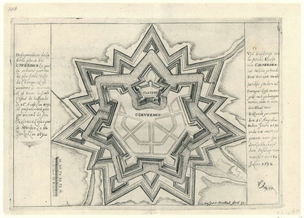 Editor: Here we have Romeyn de Hooghe's "Illustration for 'Den Arbeid van Mars' by Allain Manesson Mallet," created in 1672. It’s an engraving, and the detailed linework is quite striking, although the geometric forms make it seem less organic than one might expect from a landscape piece. How do you interpret the arrangement of shapes within this print? Curator: The composition is meticulously structured. Notice how the linear precision defines each element – from the bastion’s complex layout to the strategic arrangement of the internal spaces. Observe how the darker sections define depth through tonal variety. Do you discern a tension between the abstract form and representational intent? Editor: I do now. The shapes are almost diagrams, yet they sit above this more "painterly" landscape. What effect does that have? Curator: Precisely. De Hooghe utilizes line as a defining tool. The fortress, reduced to its essential geometric structure, exists in stark contrast to the softer depiction of the boats and figures. It underscores the intellectual ordering of space. It is almost like imposing knowledge. How does that positioning influence your understanding? Editor: I see what you mean! There is this juxtaposition between calculated geometry and a kind of 'romantic' scene beneath. It is really odd. Curator: And isn't that oddness quite compelling? Editor: Yes, it definitely highlights the complexities inherent in even seemingly straightforward depictions. Thank you. Curator: Indeed, our awareness of form opens the way to appreciating deeper layers of intention.