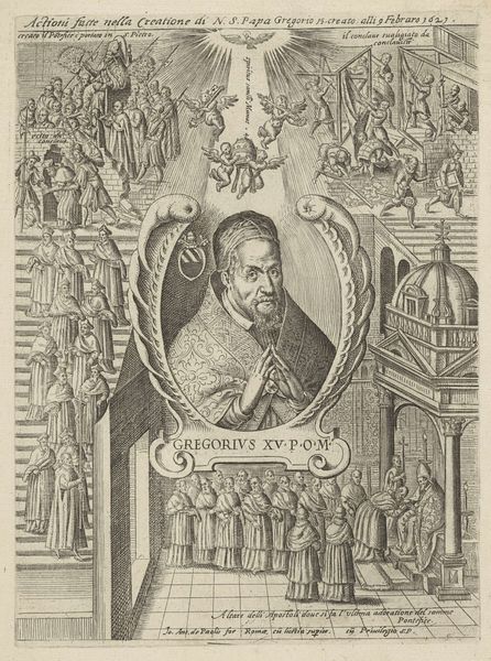 Curator: Here we have an engraving, “Portret van Frederik Schenk van Toutenburg, aartsbisschop van Utrecht,” by François van Bleyswijck, dating from between 1681 and 1726. Editor: It strikes me as severe, even a little unsettling. The crisp lines of the engraving create this formal, almost rigid depiction, and that swirling apparition in the top right certainly contributes to the overall strange feeling. Curator: It's the materiality that interests me. Consider the labor involved in creating such a detailed engraving. The tools, the skill, the socio-economic context of printmaking in the late 17th and early 18th centuries. This wasn't just art; it was a form of communication, a tool of power. The inscription below reinforces the sitter’s status as a member of the church hierarchy. Editor: And I am immediately drawn to the composition. The oval frame contains not only the portrait of the Archbishop, with that very specific pose and expression, but also a secondary scene, seemingly a council or meeting, rendered in miniature and, oddly, framed by what appears to be a cloud or smoke. It's as if his thoughts are being visually projected. What do you make of that placement, that visual association? Curator: It speaks to the labor of governance, of the social construction of religious authority. Look at the means by which he accrued power: not through divine intervention but through councils, agreements, social maneuvering. This print is a carefully crafted object of consumption meant to circulate among specific social classes, reinforcing established hierarchies. Editor: Yet there is a visual tension. The precision of the portrait contrasts with the almost dreamlike quality of that secondary scene. This contrast serves a formal purpose: a semiotic dance between reality and vision, power and… perhaps doubt? Curator: I see the image through its historical moment, produced by skilled labor and a consumer product for a select audience, and of that hierarchy of labor which defined Baroque printmaking, I'm left with more questions than answers. Who were the engravers? What was their place in the economic and social order of the period? Editor: The way the artist, van Bleyswijck, managed the pictorial space to frame meaning is impressive. Regardless of social forces behind its creation, as you note, that's formal mastery. I walk away contemplating the visual language of power—how posture, composition, and the skillful play of light and shadow all work to convey authority.