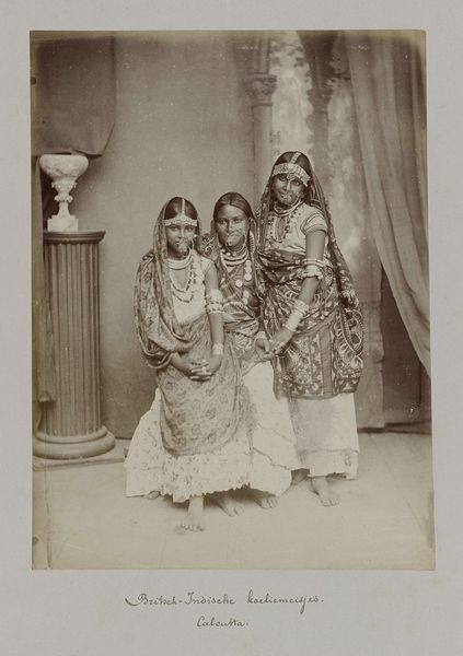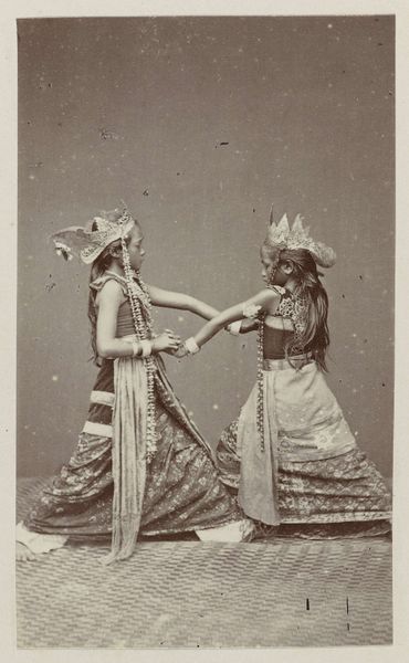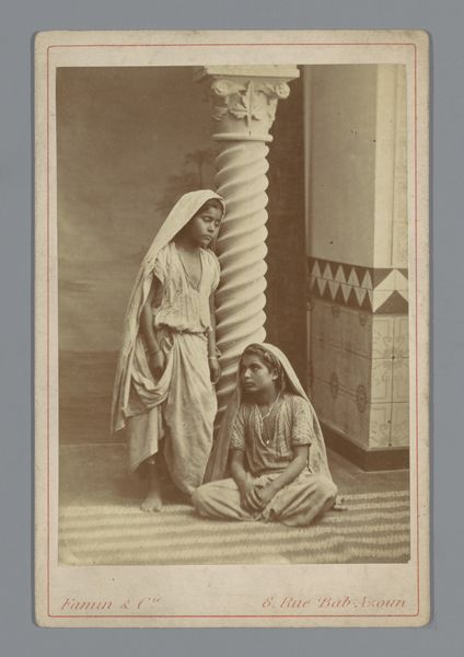 Editor: Here we have Féliz Bonfils’ “Portret van twee onbekende Syrische vrouwen, gesluierd,” a gelatin silver print dating from around 1867 to 1877. It's quite striking, these two figures shrouded in patterned cloth. There's a formality, yet also a mystery. What are your initial thoughts when you look at this photograph? Curator: The covering itself speaks volumes. We are encountering potent visual cues tied to both religious identity and gender roles in the 19th-century Middle East. Consider the gaze it denies us, replaced by intricate patterns. The fabric becomes a text, conveying status, perhaps origin, while simultaneously obscuring individual identity. What cultural narratives do you think this image engages with? Editor: I hadn't really considered the fabrics as telling a story of their own, almost like a stand-in for the women themselves. Perhaps this plays into Western ideas about the "Orient" at that time? Curator: Precisely. Think about Orientalism, the West's fascination with, and often misrepresentation of, the East. The veil was frequently used as a symbol to exoticize and often sexualize the women of these cultures, paradoxically, by concealing them. However, for these women, the veils would be part of daily life, signaling social standing, propriety, belonging, as much as they may denote faith. What do you make of the backdrop? Editor: It seems deliberately posed, almost theatrical. Like they are presenting themselves, or at least how they wish to be seen, but perhaps in line with what was expected. Curator: An interesting observation. And how much is dictated by the photographer's framing, their agenda, their position as a Westerner capturing a moment, or constructing one? It reminds us how every image is both a reflection and a refraction. Editor: It's really fascinating to consider all those layers – the cultural context, the photographer's perspective, the subjects' identities, all interacting. Curator: Indeed. This photograph encapsulates how a seemingly simple portrait can become a powerful site for interpreting identity, representation, and the complex exchange between cultures.