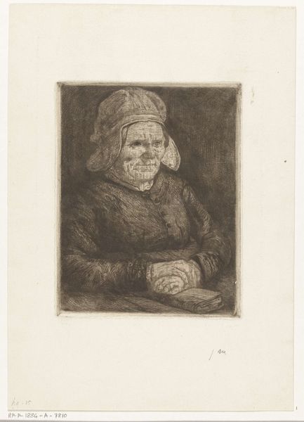 Curator: This is "Katwijkse oude vrouw," or "Old Woman of Katwijk," an etching by Jozef Israëls, likely created between 1835 and 1907. Editor: My first impression is of stark simplicity and a somber mood. The tonal range is very limited, almost monochromatic. It's quite an intimate piece, despite its humble appearance. Curator: Indeed. The image is striking for its quiet dignity, wouldn't you say? Israëls was deeply interested in representing the lives of ordinary people, especially the hardships faced by those in marginalized communities along the Dutch coast. He wasn't afraid to show the weariness and resilience etched onto the faces of these women. Editor: The heavy shading certainly reinforces that weariness. Note how the dense network of etched lines emphasizes the shadows around her eyes and the lines in her face, drawing the viewer into a feeling of empathy. The dark background sets off the whiteness of her cap, in a delicate contrast. Curator: I think Israëls wanted us to consider not just this woman's individual story, but also the collective experience of aging and hard labor within this community. It challenges the romanticized versions of rural life popular at the time. You might also notice her clothing is quite somber and plain. Editor: I am struck by the balance, even within such a simple composition. The figure is central, commanding the small picture frame, while the cap itself becomes a focal point thanks to the way it reflects the light in opposition to the shadows surrounding her. Curator: Viewing this artwork calls us to ask: How are we engaging with the narratives of older women today? Are their stories being centered, or overlooked? Editor: Well, looking at the network of lines that create the woman’s face, it encourages a focused reflection on the structure that Israels developed and its effect on our perspective. Curator: An incredibly valuable piece that highlights both the artist's skill and empathy. Editor: Precisely. A study in balance.
