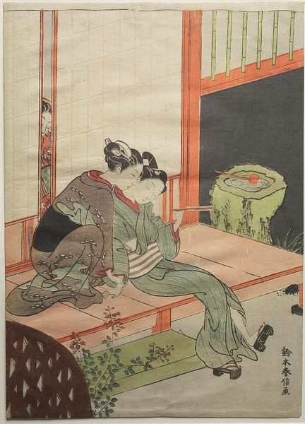Curator: This is Utagawa Kunisada's "Triptych: Women by Verandah (Harusame no kei)," created at an unknown date. The piece, a woodblock print, resides at the Harvard Art Museums. Editor: It's gorgeous! The pastel colors create a sense of quiet intimacy and the details of daily life offer a glimpse into the lives of these women. Curator: Indeed. Kunisada was a leading printmaker of the Utagawa school. This triptych is illustrative of his focus on the lives of women and the cultural significance of the pleasure districts in Edo-period Japan. We should consider the social roles of the women depicted here. Editor: Absolutely. It's important to contextualize these images, and understand how gender, class, and even sexuality were negotiated within the art market and visual culture of the time. Curator: Kunisada's prints helped shape perceptions of women and popular culture in his era. He presents a constructed, idealized view, but they offer insight into the lived experiences of some women. Editor: Looking closely, I wonder what stories and identities are concealed beneath the surface of the art. It's a challenge to interpret these images through a modern lens, but the glimpse into the past is enriching. Curator: It's truly illuminating to see how these artworks provide a lens to analyze our own contemporary values and biases.