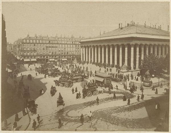 Editor: Here we have "Gezicht op de Beurs van Parijs," a photograph believed to have been taken between 1887 and 1900 by X phot. The photo is incredibly detailed, capturing a bustling cityscape. It feels almost cinematic, like a still from an early film. How do you interpret the scene captured in this photograph? Curator: The photograph presents a seemingly straightforward depiction of the Paris stock exchange, but it invites us to consider the layers of power and societal structures at play. Look closely. Who has access to this space, and who is excluded? Editor: Well, it looks like mostly men in suits going up and down the steps, though it's hard to be sure given the distance. I don't see any women on the steps, but there are a few near the carriages. Curator: Precisely. This visual reinforces the limited roles afforded to women and the working class at the time. While depicting the financial center, it also implicitly comments on the unequal distribution of wealth and influence. What about the architectural style? Does it evoke any particular feeling? Editor: It's grand and imposing, very classical. Like a Roman temple. It definitely communicates stability, maybe even permanence. Curator: And that’s key, isn't it? The architecture is deliberately referencing a past of empire and dominance to project a sense of unwavering authority for the institution of the stock exchange. Consider also how the Orientalist aesthetic in photography might contribute to ideas of Parisian cultural dominance, even in a picture so concerned with Western themes. Editor: So, the photo, at first glance just a cityscape, becomes a statement about the social and economic order of the time. Curator: Exactly. It serves as a reminder that even seemingly objective images are embedded with power dynamics and cultural narratives that deserve our critical attention. Editor: That's fascinating. I’ll never look at a cityscape the same way again! Curator: And hopefully begin to question what realities and perspectives get omitted from the picture.
