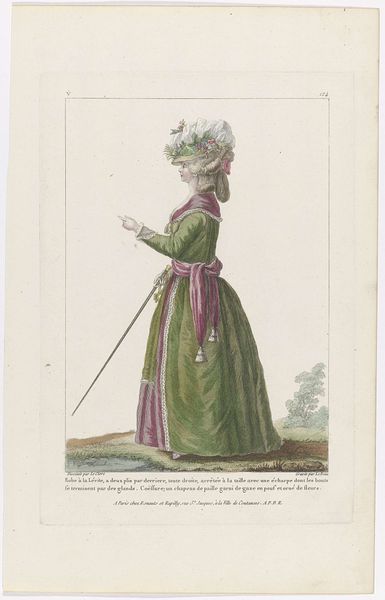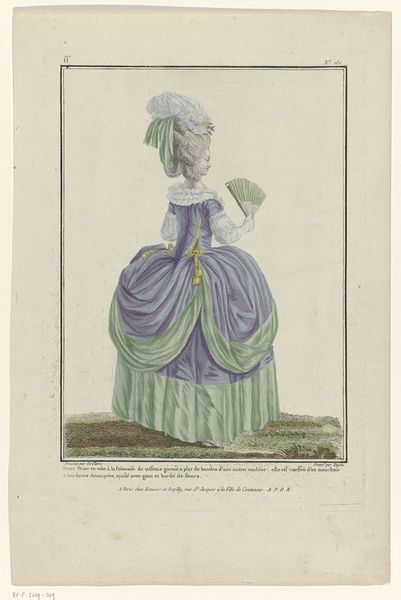 Curator: "Gallerie des Modes," dating from around 1784. We're looking at an elegant figure captured in watercolor by Nicolas Dupin, a testament to the era's fascination with fashion and social presentation. It resides here at the Rijksmuseum. Editor: Isn't it wonderfully weird? Her posture is so rigid and almost doll-like, yet the color palette is surprisingly soft and muted. I can’t help but smile! There is a certain gentleness, a touch of satire, maybe? Curator: The satire lies in the exaggerated silhouette, conforming to then-contemporary standards of beauty, which privileged artifice and overt display of status. That's reflected in that gravity-defying headwear. What do you read into her turned back? Editor: Oh, I think that turned back only adds to the humor. Like she's about to step into some grand misunderstanding! And the textures – all that frill – feel opulent and restrained. The cane just seems to add to a sort of, what would you say? Distant air? Curator: Certainly, these details reflect the hierarchical structures of 18th-century French society. Fashion was rigorously dictated, class-stratified, and gendered. This lady is signaling her adherence to, or perhaps, her subversion of those rules. It also alludes to a larger conversation on colonial trade through textiles and accessories. Editor: So much weight in a little sketch. And even though it feels incredibly detached from today's fashion scene, I love seeing the small similarities. In what the artist captures as precious. What do you suppose someone from that time seeing something similar today, even only through the internet, would feel? Curator: I would guess perhaps something akin to recognizing echoes of our past, yet viewing through the ever-present gaze of contemporary social structures and historical awareness. Editor: Yes! Even just to notice all these complex undertones swirling beneath something so seemingly frivolous. This piece makes me think differently, for sure. Curator: Indeed. It’s a reminder that even seemingly superficial aspects of culture are deeply intertwined with socio-political forces.